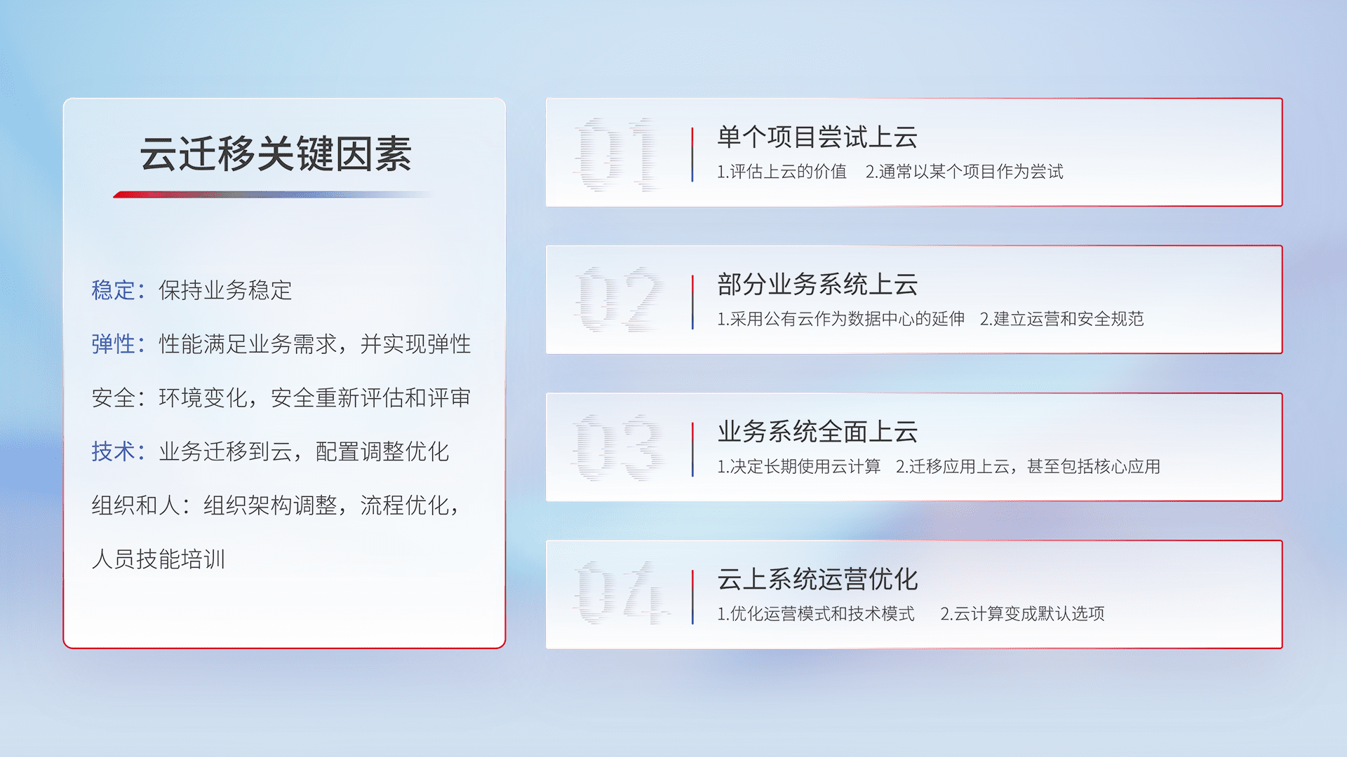 结合实际业务,,,从规划设计、、、云平台选型、、、、云原生改造、、、、数据迁移、、、集成交付,,迁移全过程为客户识别最佳上云路径,,,做好风险识别管理,,设计网络架构、、身份权限、、、安全审计合规、、操作审计、、日志审计、、、监控告警策略、、、多站点容灾设计等,,对云上基础设施进行整体规划,,,,提升IT治理水平,,,以满足弹性、、、、高可用、、高性能的需求。。。