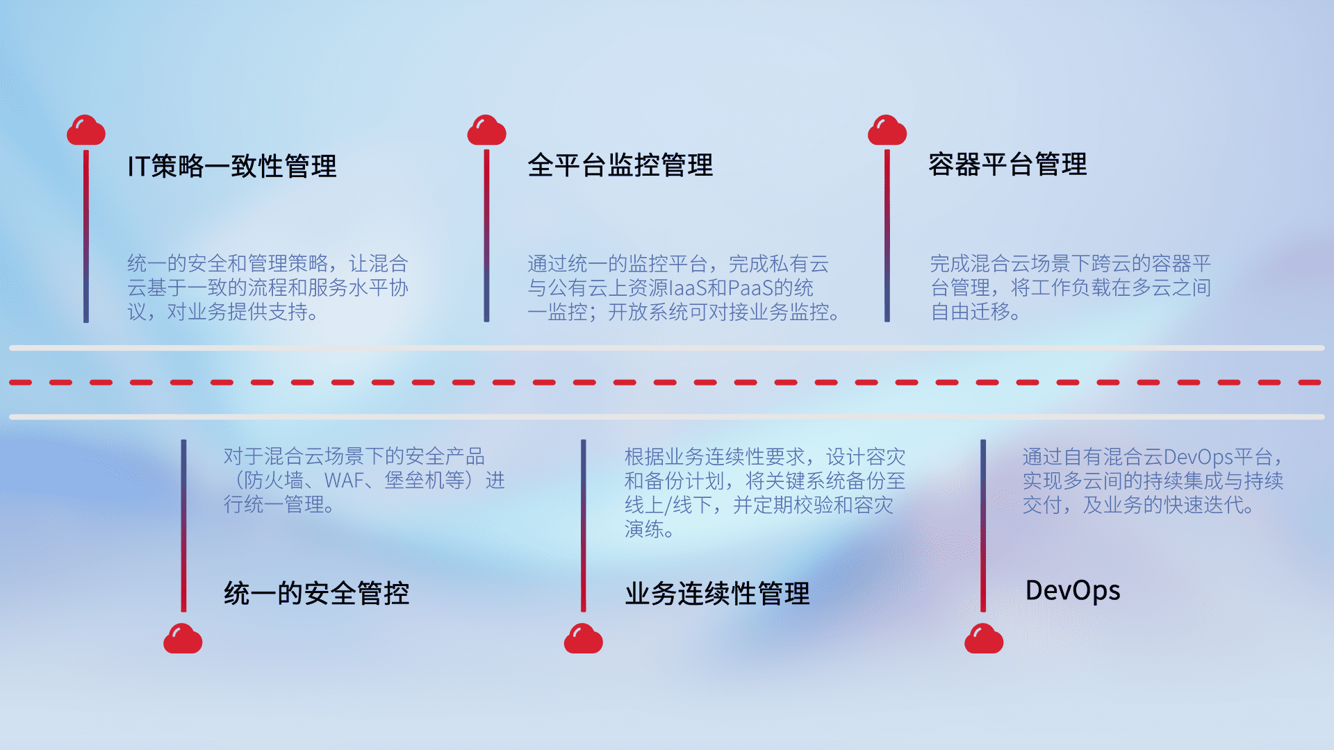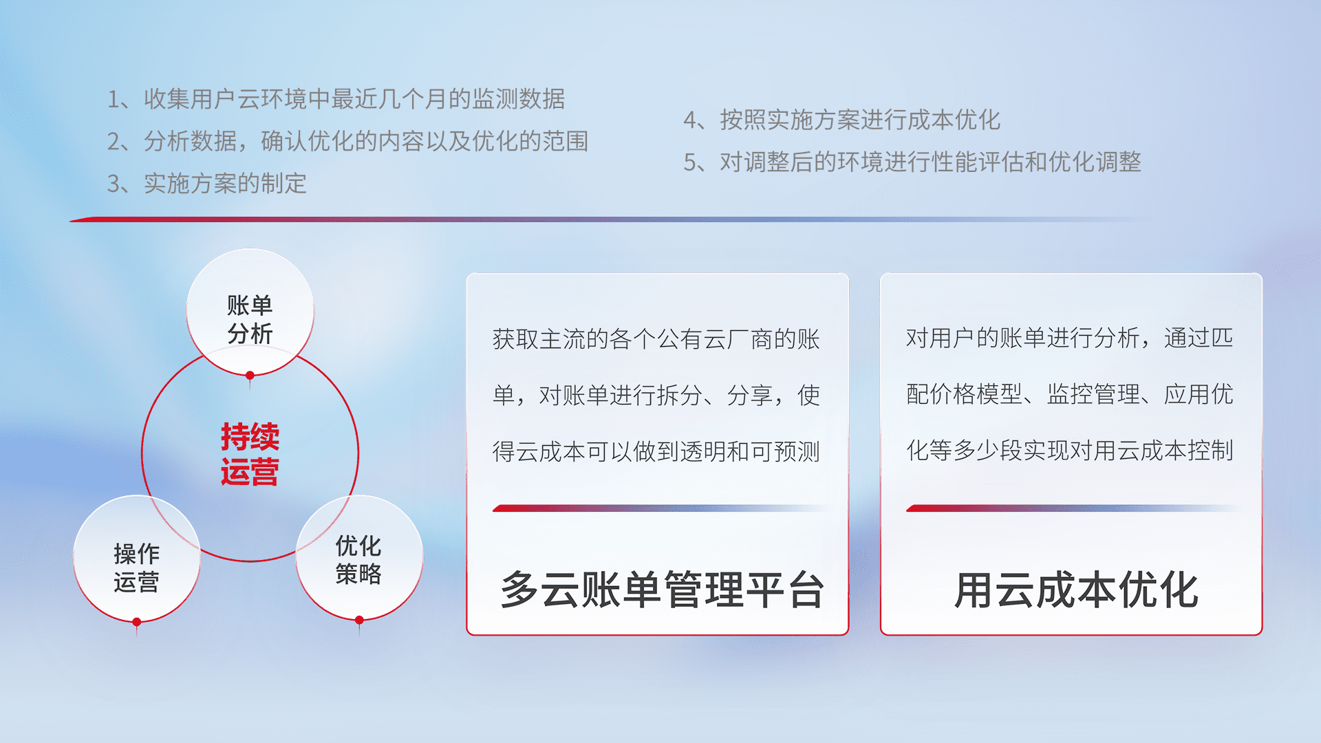 通过多云纳管,,,,以统一的资源数据模型把客户的云资源进行抽象和封装,,,进而实现对多云资源的统一操作,,保障云资源管理的可靠性、、稳定性与可用性。。。。量身定制化运维内容,,,配置、、、开发运维、、、、补丁管理、、备份、、监控、、认证和访问管理、、审计和日常巡检等,,保障在用云过程中的可靠度,,稳定度以及高可用率。。